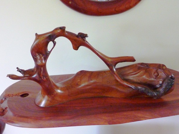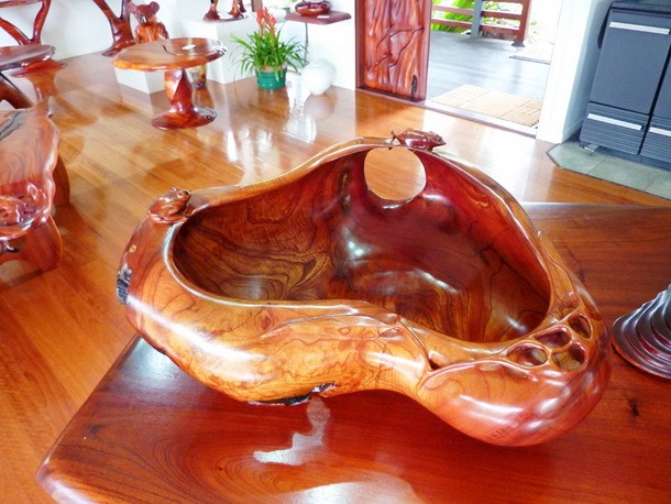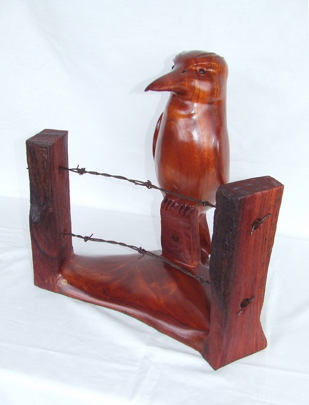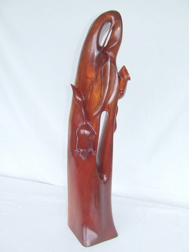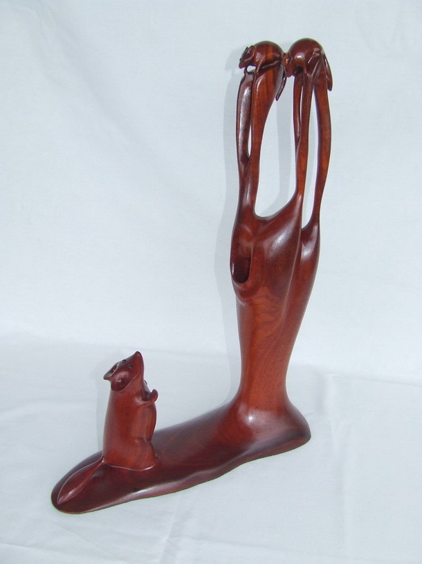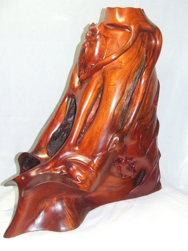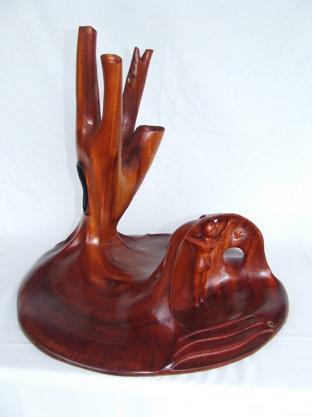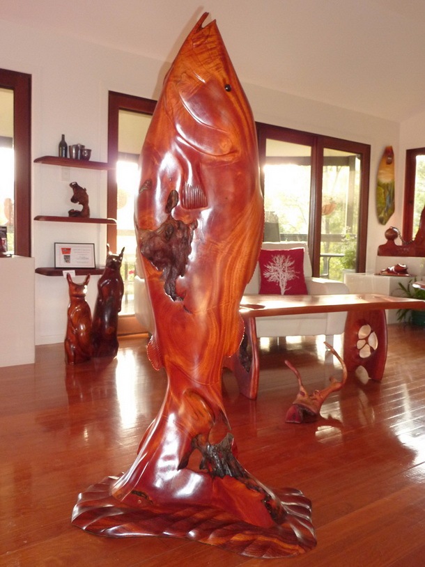 His skills are self taught and are constantly being perfected as the years go by. Whatever his latest creation might be he is able to bring out the natural rich colour and grain of the timber and work it into the story of each piece. He is versatile in his creations and each sculpture can be boasted as being a one-off because of the uniqueness of each piece of timber.